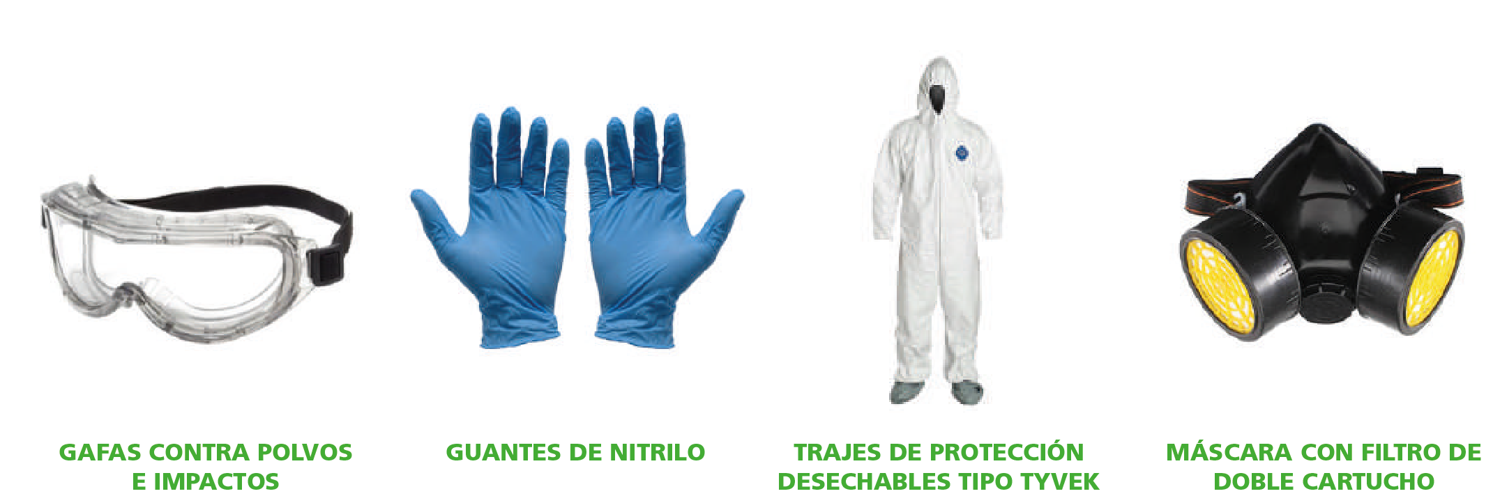 Para la realización de tareas de fumigación, se aplicarán procedimientos establecidos por nuestros profesionales de Higiene y Seguridad, utilizando los siguientes equipos de protección personal: Traje descartable tipo Tyvek, cubrecalzado de tyvek o calzado de seguridad blanco, guantes de nitrilo, protección ocular y máscara con filtro N95 .